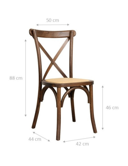 Scaun cu dimensiunile lățime 42 cm, adâncime 44 cm, înălțime 88 cm în stil Thonet realizat din frasin masiv cu spătar încrucișat. Datorită designului său bistro, este ideal pentru a mobila orice cameră sau local în stil vintage, fără a sacrifica confortul. Înălțimea de la podea la scaun este de 46 cm.