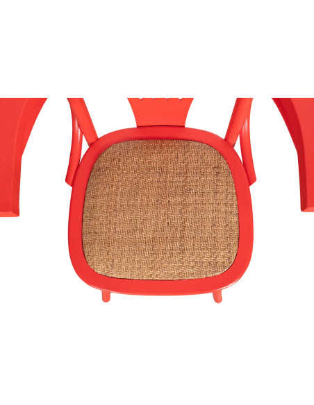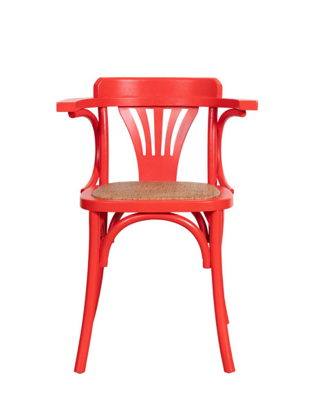 Scaun Thonet cu brațe din lemn masiv de frasin cu finisaj roșu și șezut din ratan