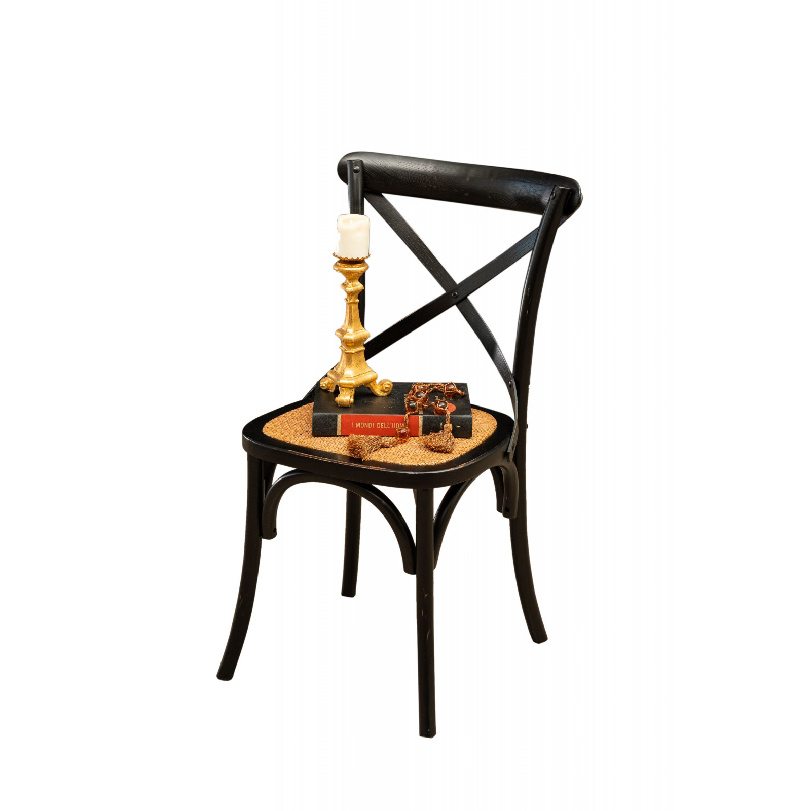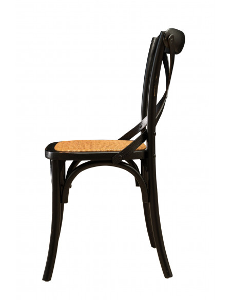 Scaun lățime 48 cm, adâncime 52 cm, înălțime 88 cm, în stil Thonet, din frasin masiv, cu spătar încrucișat și șezut din rattan împletit. Datorită designului său bistro, este ideal pentru a decora orice cameră sau spațiu în stil vintage, fără a sacrifica confortul.