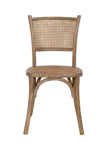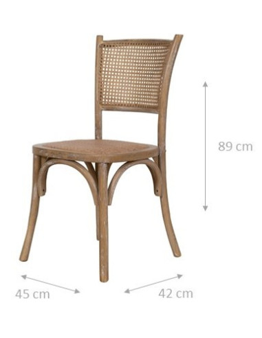 Scaun latime 48 cm, adancime 52 cm, inaltime 88 cm in stil Thonet din frasin masiv cu spatar incrucisat si sezut din fibra de ratan impletita. Datorita designului lor bistro, sunt ideale pentru a decora orice mediu sau incapere in stil vintage, fara a sacrifica confortul.Toate măsurătorile se referă la dimensiunea maximă a articolului.