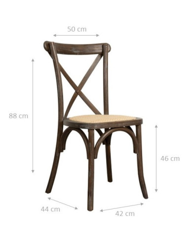 Scaun cu dimensiunile lățime 42 cm, adâncime 44 cm, înălțime 88 cm în stil Thonet realizat din frasin masiv cu spătar încrucișat. Datorită designului său bistro, este ideal pentru a mobila orice cameră sau local în stil vintage, fără a sacrifica confortul. Înălțimea de la podea la scaun este de 46 cm.