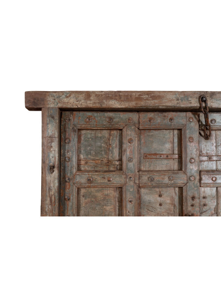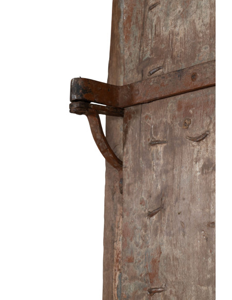 Ușă antică din lemn masiv de tec, cu lungimea de 202 cm, adâncimea de 23 cm și înălțimea de 229 cm. Această ușă provine din demolarea și restaurarea unor clădiri vechi și importante. Restaurată cu grijă și tratată pentru utilizare în exterior, fiecare ușă este o piesă antică autentică și unică. Toate măsurătorile se referă la dimensiunile maxime ale articolului.