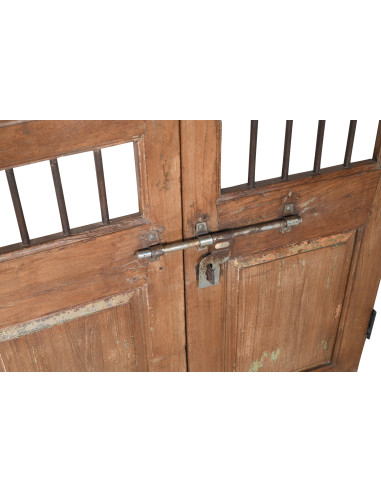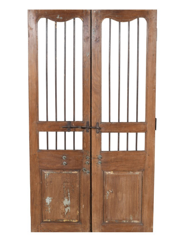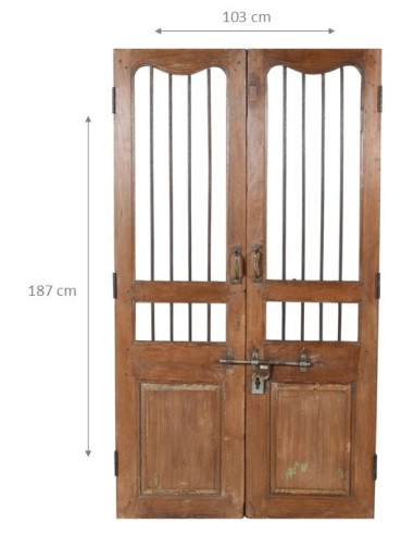 Ușă antică din lemn masiv de tec, cu lungimea de 103 cm, adâncimea de 4 cm și înălțimea de 187 cm. Această ușă provine din demolarea și restaurarea unor clădiri vechi și importante. Restaurată cu grijă și tratată pentru utilizare în exterior, fiecare ușă este o piesă antică autentică și unică. Toate măsurătorile se referă la dimensiunile maxime ale articolului.
