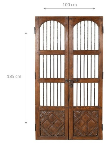 Ușă antică din lemn masiv de tec, cu lungimea de 100 cm, adâncimea de 4 cm și înălțimea de 185 cm. Această ușă provine din demolarea și restaurarea unor clădiri vechi și importante. Restaurată cu grijă și tratată pentru utilizare în exterior, fiecare ușă este o piesă antică autentică și unică. Toate măsurătorile se referă la dimensiunile maxime ale articolului.