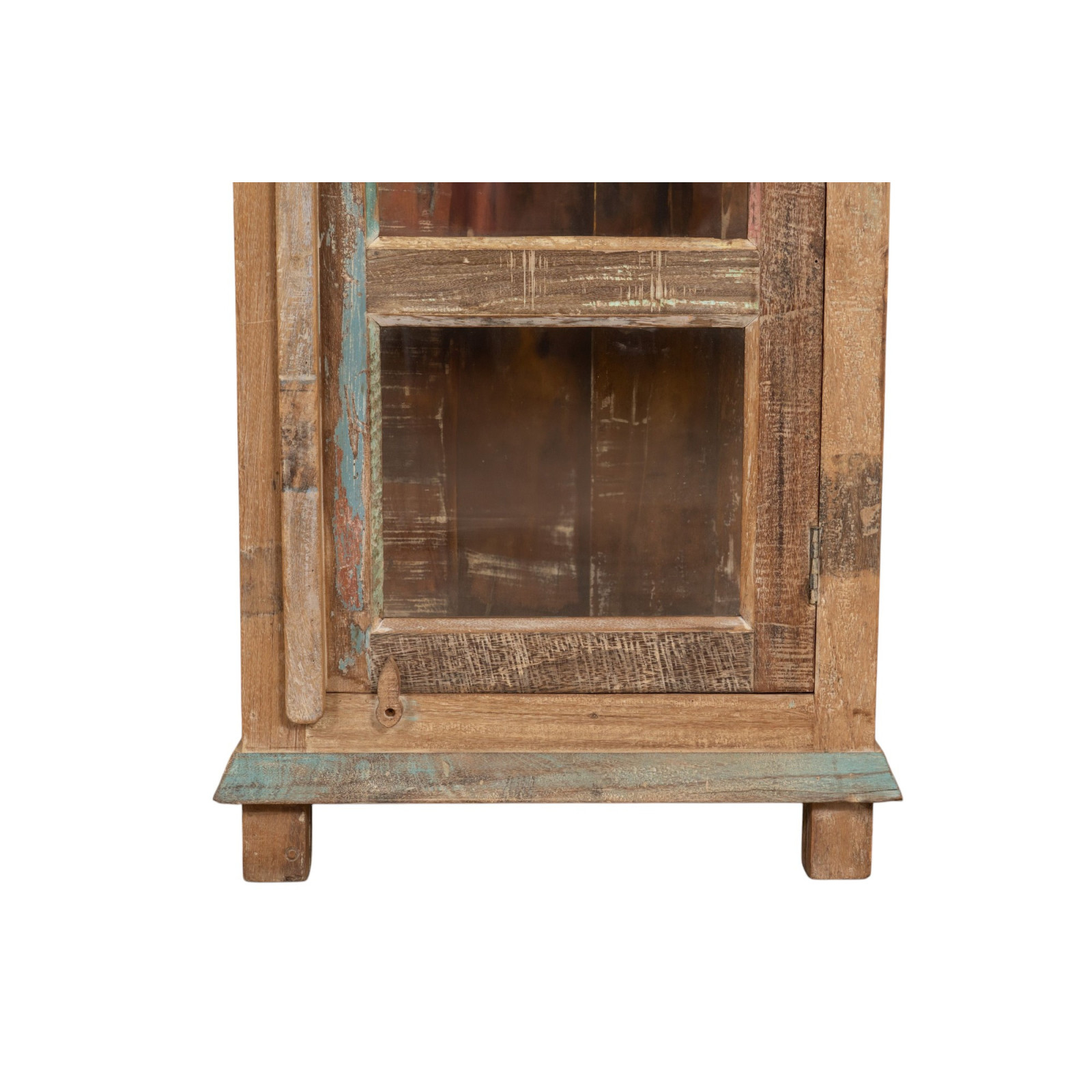 Vitrină realizată din lemn masiv reciclat, cu dimensiunile de 60 cm lățime, 40 cm adâncime și 136 cm înălțime. Pictată manual cu vopsele naturale, nuanțele multiple fac ca această piesă de mobilier să fie unică. Solidă și funcțională, este ideală pentru iubitorii de mobilier antic și lemn.